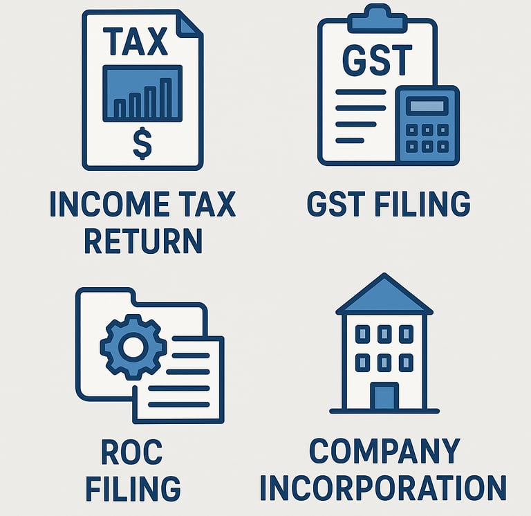 Professional assistance for filing income tax returns and GST returns with accuracy and efficiency.